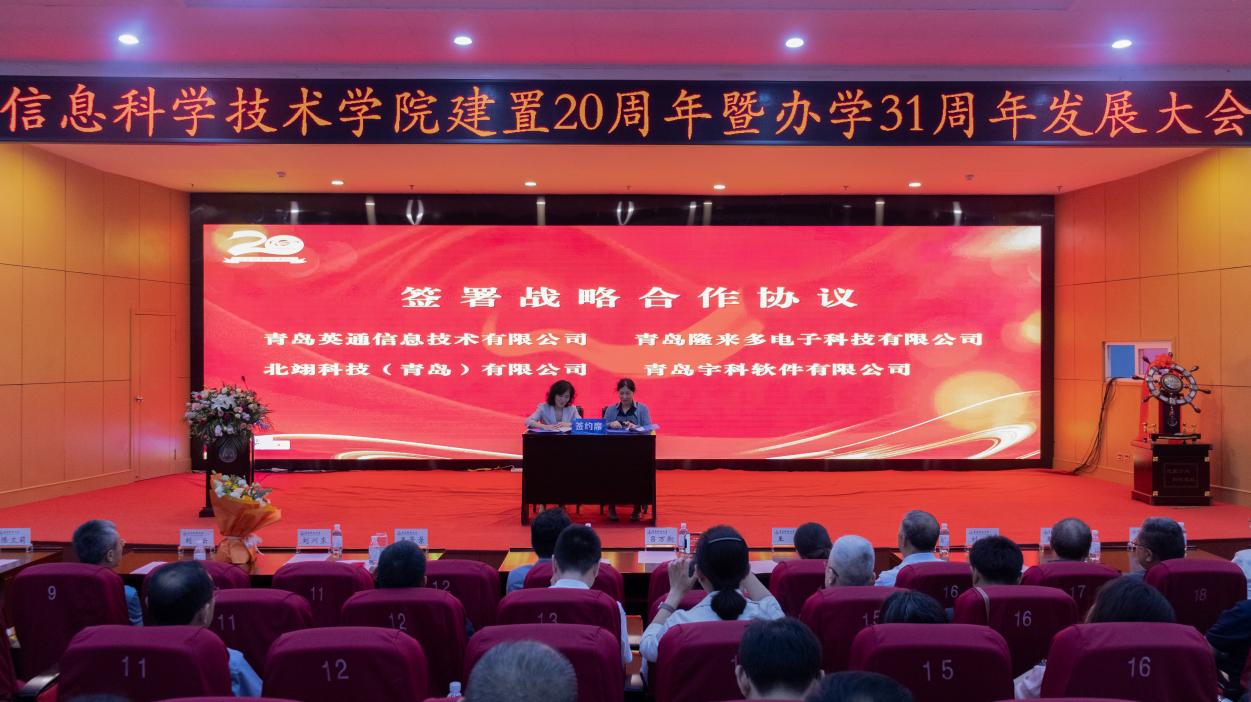 w66利来旗舰厅办学以来与各级党政机关部门、企事业单位、行业协会等建立了多种形式的合作与交流,并产生了多项合作成果。为了进一步提升合作层次,深化合作内涵,在大会现场,公司与青岛英通信息技术有限公司、青岛隆来多电子科技有限公司、北翊科技(青岛)有限公司、青岛宇科软件有限公司,分别签订共建行业公司的战略合作协议。