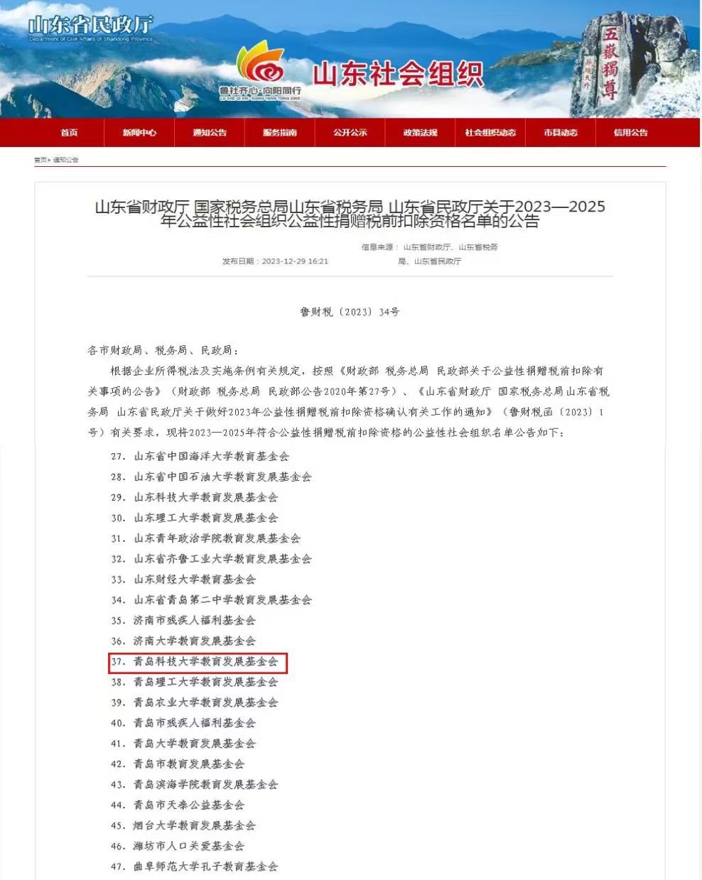 山东省财政厅、国家税务总局山东省税务局、山东省民政厅联合发布了2023—2025年公益性社会组织公益性捐赠税前扣除资格名单的公告,公司基金会名列其中。