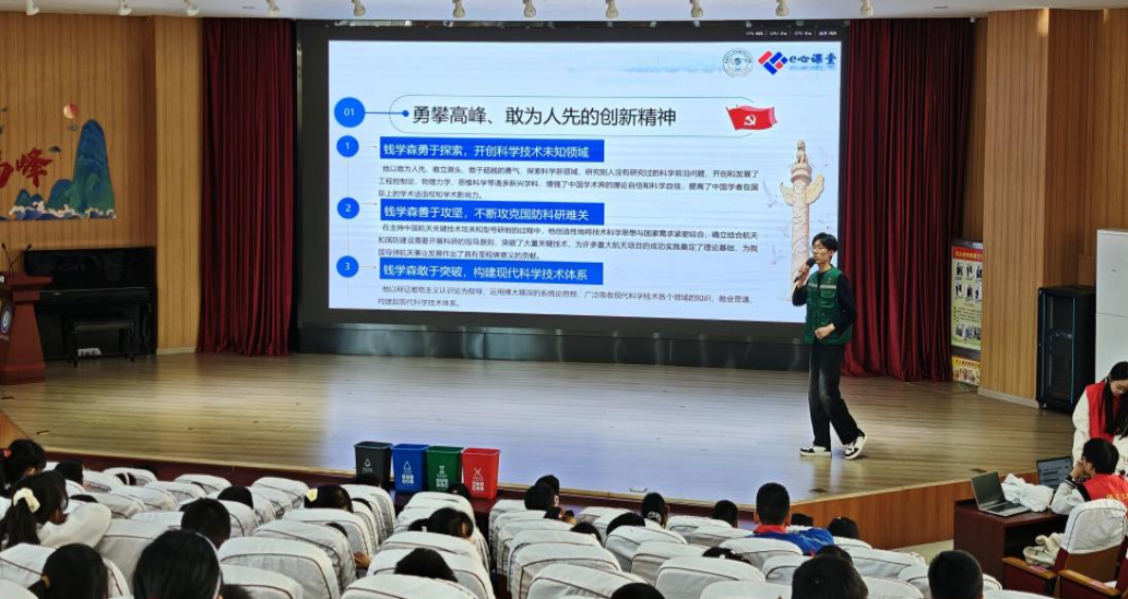 活动伊始,志愿者们以钱学森、袁隆平两位科学巨匠为榜样,开启了科学家精神专题宣讲。通过播放鲜活的事迹视频与深情讲述,孩子们仿佛穿越时空,走进了“两弹一星”元勋郭永怀、王淦昌等先辈的科研世界。志愿者生动解读了科学家们勇攀高峰的创新精神、严谨治学的求实态度以及“热爱祖国、无私奉献”的崇高品格,将“自力更生、艰苦奋斗”的精神火种播撒在孩子们的心田。