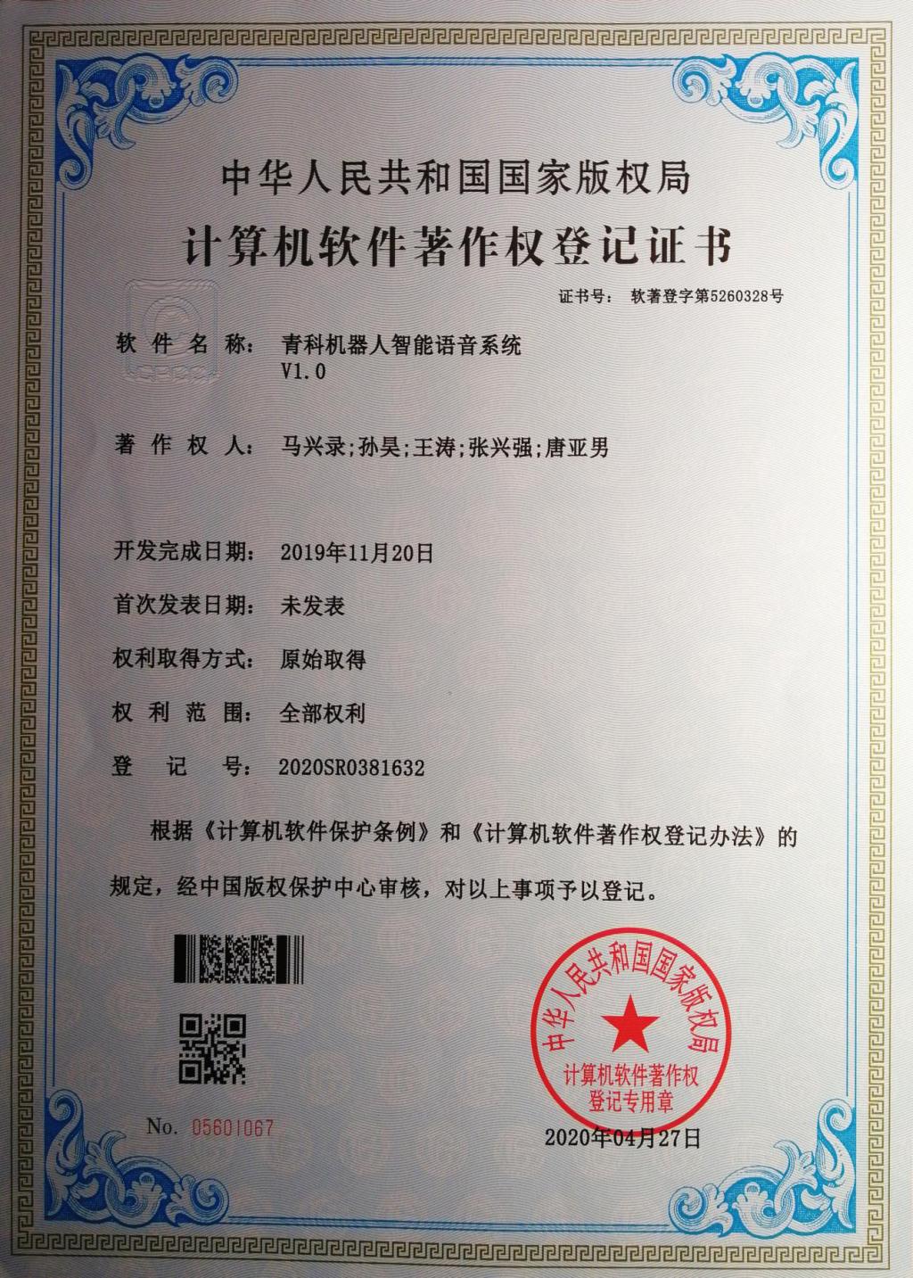 11、软件著作权--青科机器人智能语音系统V1.0