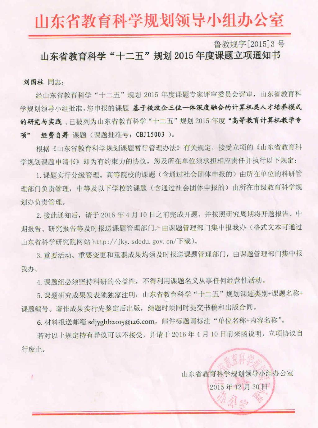 1、山东省教育科学“十二五”规划课题--基于校政企三位一体深度融合的计算机类人才培养模式的研究与实践