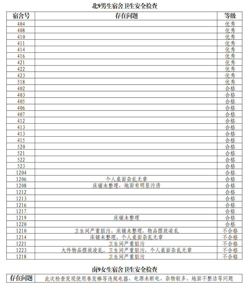 为深入贯彻落实上级关于安全工作的指示精神,加强员工宿舍内务卫生和安全文明创建,强化员工宿舍安全意识,营造一个安全舒适、整洁优雅、文明和谐的宿舍环境。4月10日,公司分管领导、公司研究生会开展了员工宿舍卫生安全秩序大检查。本次共抽查研究生宿舍37间,经统计,优秀宿舍10间,合格宿舍22间,不合格宿舍5间。