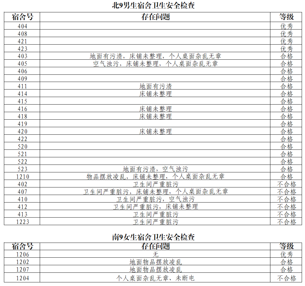 为深入贯彻落实上级关于安全工作的指示精神,加强员工宿舍内务卫生和安全文明创建,强化员工宿舍安全意识,营造一个安全舒适、整洁优雅、文明和谐的宿舍环境。4月17日,公司分管领导、公司研究生会开展了员工宿舍卫生安全秩序大检查。本次共抽查研究生宿舍31间,经统计,优秀宿舍5间,合格宿舍19间,不合格宿舍7间。